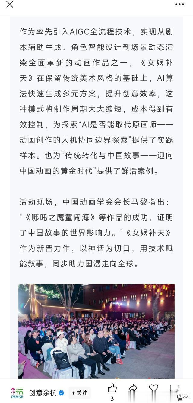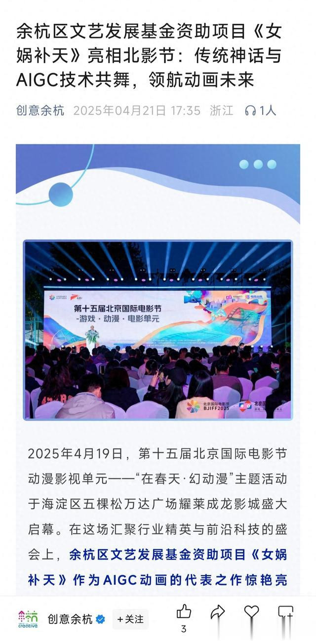 创意余杭的官方公众号还撰文“余杭区文艺发展基金资助项目《女娲补天》亮相北影节:传统神话与AIGC技术共舞,领航动画未来”进行了介绍了