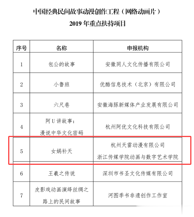 《女娲补天》动画还入选了中国经典民间故事动漫创作工程(网络动画片)2019年重点扶持项目,申报机构为杭州天雷动漫有限公司和浙江传媒学院动画与数字艺术学院,